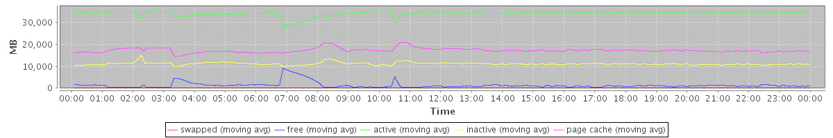 avg(swapped) = 16.94 avg(free) = 1321.66 avg(active) = 34229.67 avg(inactive) = 11179.33 avg(page cache) = 17298.08