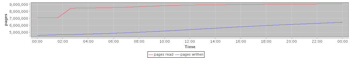 avg(pages read) = 8701408.22 avg(pages written) = 5440846.27