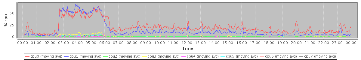 avg(cpu0) = 20.45 avg(cpu1) = 13.96 avg(cpu2) = 0.58 avg(cpu3) = 1.14 avg(cpu4) = 0.29 avg(cpu5) = 0.45 avg(cpu6) = 0.32 avg(cpu7) = 0.25