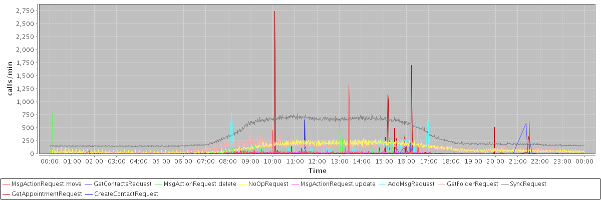 max(MsgActionRequest.move) = 1327.00 max(GetContactsRequest) = 630.00 max(MsgActionRequest.delete) = 765.00 max(NoOpRequest) = 291.00 max(MsgActionRequest.update) = 161.00 max(AddMsgRequest) = 795.00 max(GetFolderRequest) = 428.00 max(SyncRequest) = 767.00 max(GetAppointmentRequest) = 2743.00 max(CreateContactRequest) = 653.00