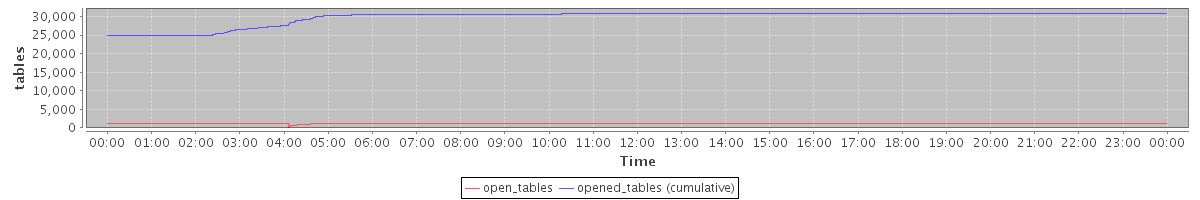 avg(open_tables) = 1190.29 avg(opened_tables (cumulative)) = 29764.57