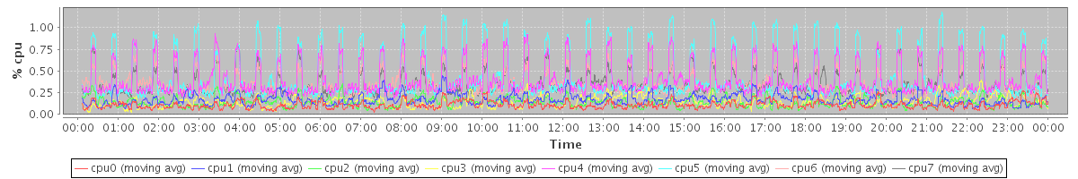 avg(cpu0) = 0.11 avg(cpu1) = 0.17 avg(cpu2) = 0.14 avg(cpu3) = 0.14 avg(cpu4) = 0.41 avg(cpu5) = 0.44 avg(cpu6) = 0.36 avg(cpu7) = 0.35
