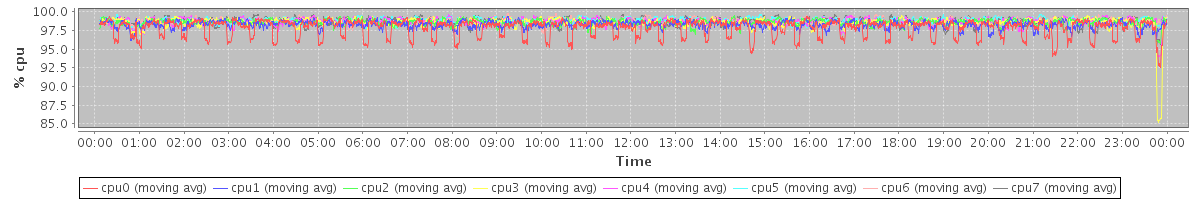avg(cpu0) = 97.84 avg(cpu1) = 98.29 avg(cpu2) = 98.57 avg(cpu3) = 98.57 avg(cpu4) = 98.70 avg(cpu5) = 98.82 avg(cpu6) = 98.78 avg(cpu7) = 98.75