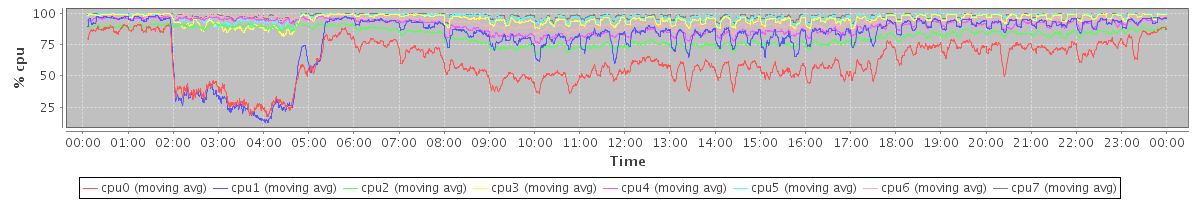 avg(cpu0) = 21.90 avg(cpu1) = 13.06 avg(cpu2) = 0.94 avg(cpu3) = 1.08 avg(cpu4) = 0.74 avg(cpu5) = 0.60 avg(cpu6) = 0.37 avg(cpu7) = 0.21