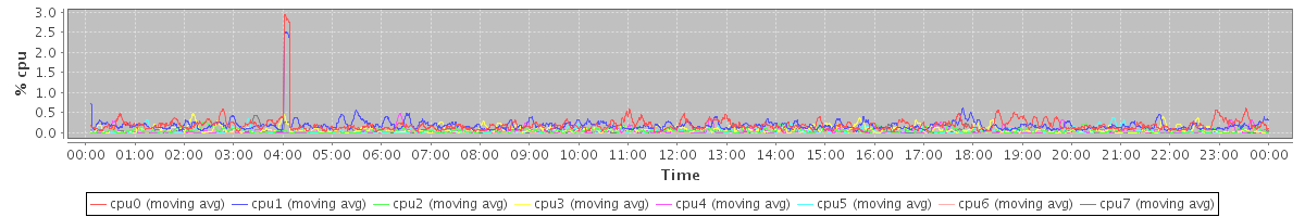 avg(cpu0) = 0.19 avg(cpu1) = 0.19 avg(cpu2) = 0.05 avg(cpu3) = 0.08 avg(cpu4) = 0.04 avg(cpu5) = 0.04 avg(cpu6) = 0.03 avg(cpu7) = 0.03
