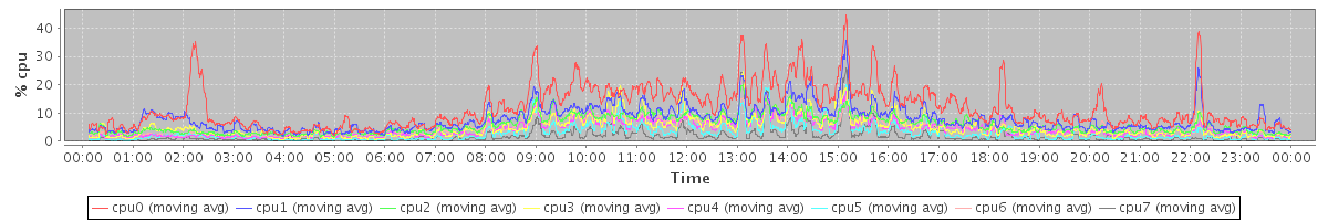 avg(cpu0) = 1.08 avg(cpu1) = 0.92 avg(cpu2) = 0.75 avg(cpu3) = 0.62 avg(cpu4) = 0.61 avg(cpu5) = 0.46 avg(cpu6) = 0.69 avg(cpu7) = 0.36