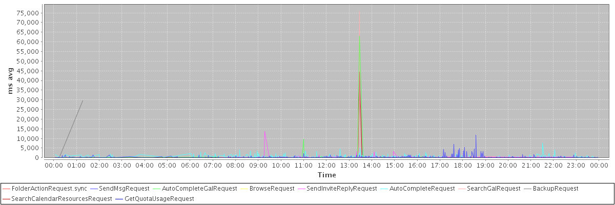 avg(FolderActionRequest.sync) = 592.00 avg(SendMsgRequest) = 286.44 avg(AutoCompleteGalRequest) = 598.83 avg(BrowseRequest) = 309.00 avg(SendInviteReplyRequest) = 583.36 avg(AutoCompleteRequest) = 478.83 avg(SearchGalRequest) = 1233.55 avg(BackupRequest) = 15106.50 avg(SearchCalendarResourcesRequest) = 380.86 avg(GetQuotaUsageRequest) = 1120.00