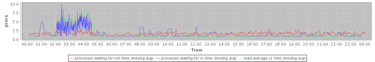 avg(processes waiting for run time) = 0.86 avg(processes waiting for io time) = 0.52 avg(load average (1 min)) = 1.44