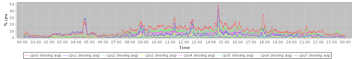 avg(cpu0) = 14.53 avg(cpu1) = 9.90 avg(cpu2) = 0.58 avg(cpu3) = 0.90 avg(cpu4) = 0.34 avg(cpu5) = 0.53 avg(cpu6) = 0.13 avg(cpu7) = 0.10