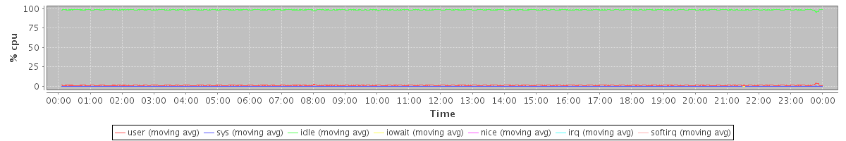 avg(user) = 1.24 avg(sys) = 0.15 avg(idle) = 98.57 avg(iowait) = 0.03 avg(nice) = 0.00 avg(irq) = 0.00 avg(softirq) = 0.00