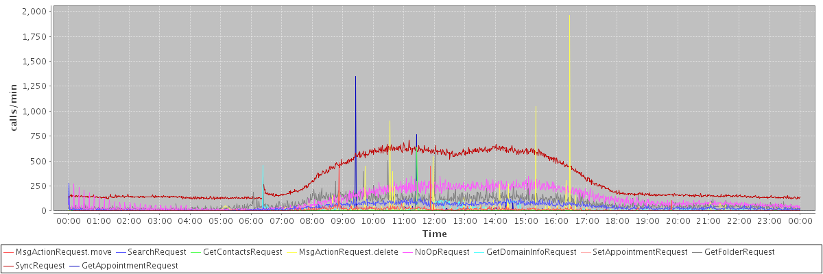 max(MsgActionRequest.move) = 491.00 max(SearchRequest) = 279.00 max(GetContactsRequest) = 634.00 max(MsgActionRequest.delete) = 1963.00 max(NoOpRequest) = 345.00 max(GetDomainInfoRequest) = 455.00 max(SetAppointmentRequest) = 170.00 max(GetFolderRequest) = 603.00 max(SyncRequest) = 712.00 max(GetAppointmentRequest) = 1348.00