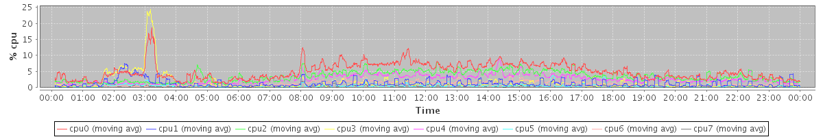 avg(cpu0) = 13.93 avg(cpu1) = 0.81 avg(cpu2) = 0.46 avg(cpu3) = 7.90 avg(cpu4) = 0.25 avg(cpu5) = 0.26 avg(cpu6) = 0.04 avg(cpu7) = 0.10