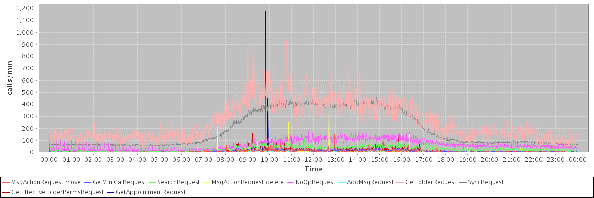 max(MsgActionRequest.move) = 149.00 max(GetMiniCalRequest) = 102.00 max(SearchRequest) = 155.00 max(MsgActionRequest.delete) = 358.00 max(NoOpRequest) = 189.00 max(AddMsgRequest) = 117.00 max(GetFolderRequest) = 942.00 max(SyncRequest) = 457.00 max(GetEffectiveFolderPermsRequest) = 156.00 max(GetAppointmentRequest) = 1177.00