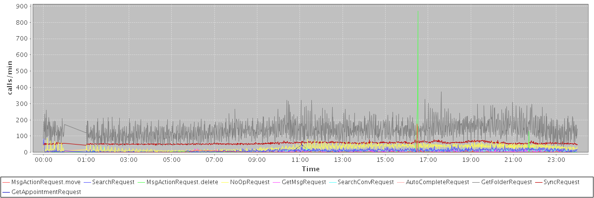 max(MsgActionRequest.move) = 175.00 max(SearchRequest) = 83.00 max(MsgActionRequest.delete) = 870.00 max(NoOpRequest) = 87.00 max(GetMsgRequest) = 32.00 max(SearchConvRequest) = 34.00 max(AutoCompleteRequest) = 38.00 max(GetFolderRequest) = 373.00 max(SyncRequest) = 77.00 max(GetAppointmentRequest) = 46.00