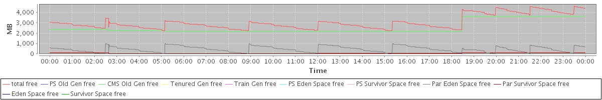 avg(total free) = 3038.67 avg(PS Old Gen free) = 0.00 avg(CMS Old Gen free) = 2527.49 avg(Tenured Gen free) = 0.00 avg(Train Gen free) = 0.00 avg(PS Eden Space free) = 0.00 avg(PS Survivor Space free) = 0.00 avg(Par Eden Space free) = 450.37 avg(Par Survivor Space free) = 60.81 avg(Eden Space free) = 0.00 avg(Survivor Space free) = 0.00