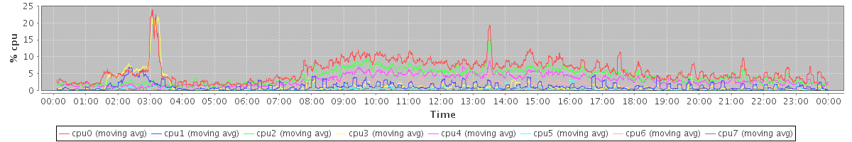 avg(cpu0) = 11.73 avg(cpu1) = 0.72 avg(cpu2) = 0.32 avg(cpu3) = 6.60 avg(cpu4) = 0.18 avg(cpu5) = 0.24 avg(cpu6) = 0.05 avg(cpu7) = 0.09