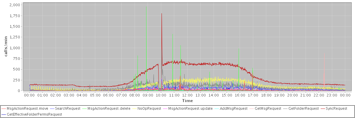 max(MsgActionRequest.move) = 422.00 max(SearchRequest) = 267.00 max(MsgActionRequest.delete) = 1962.00 max(NoOpRequest) = 329.00 max(MsgActionRequest.update) = 290.00 max(AddMsgRequest) = 128.00 max(GetMsgRequest) = 875.00 max(GetFolderRequest) = 955.00 max(SyncRequest) = 1805.00 max(GetEffectiveFolderPermsRequest) = 223.00