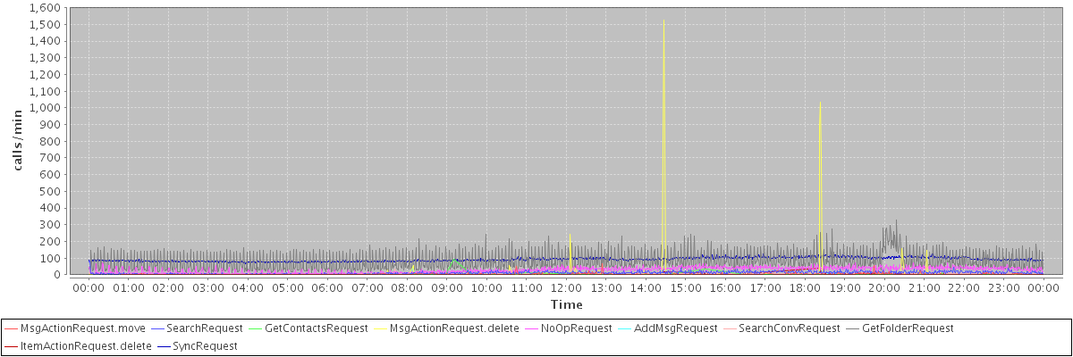 max(MsgActionRequest.move) = 64.00 max(SearchRequest) = 81.00 max(GetContactsRequest) = 90.00 max(MsgActionRequest.delete) = 1527.00 max(NoOpRequest) = 71.00 max(AddMsgRequest) = 54.00 max(SearchConvRequest) = 40.00 max(GetFolderRequest) = 328.00 max(ItemActionRequest.delete) = 37.00 max(SyncRequest) = 124.00