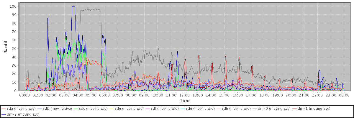 avg(sda) = 9.55 avg(sdb) = 6.93 avg(sdc) = 6.36 avg(sde) = 9.55 avg(sdf) = 6.94 avg(sdg) = 6.36 avg(sdh) = 2.15 avg(dm-0) = 26.25 avg(dm-1) = 5.03 avg(dm-2) = 10.36