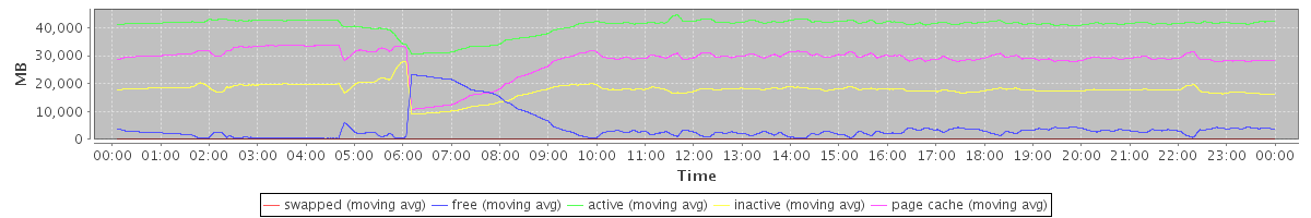 avg(swapped) = 52.27 avg(free) = 4085.72 avg(active) = 40717.53 avg(inactive) = 17604.11 avg(page cache) = 28474.75