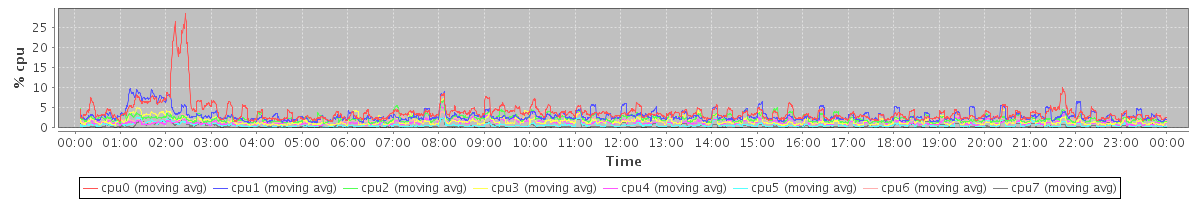 avg(cpu0) = 8.76 avg(cpu1) = 1.07 avg(cpu2) = 0.34 avg(cpu3) = 0.31 avg(cpu4) = 0.15 avg(cpu5) = 0.09 avg(cpu6) = 0.09 avg(cpu7) = 0.03