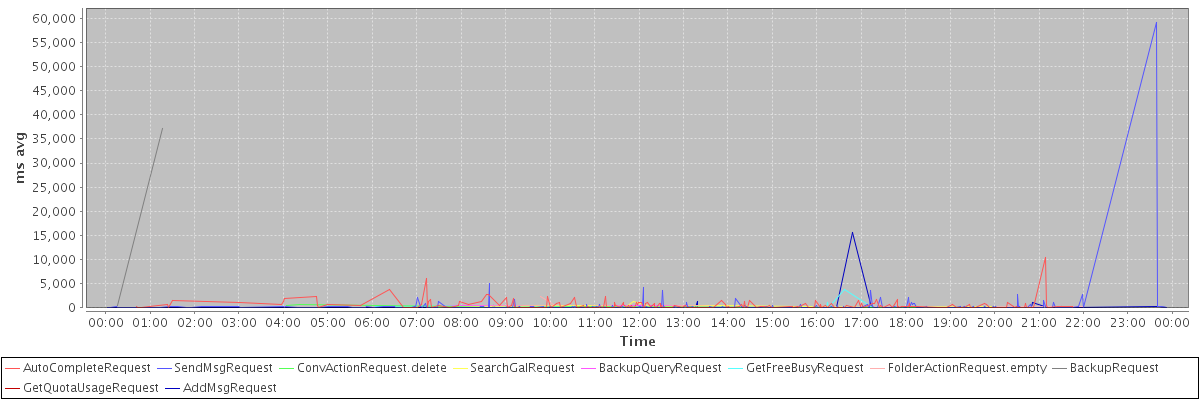 avg(AutoCompleteRequest) = 493.16 avg(SendMsgRequest) = 341.33 avg(ConvActionRequest.delete) = 244.29 avg(SearchGalRequest) = 370.89 avg(BackupQueryRequest) = 436.40 avg(GetFreeBusyRequest) = 378.81 avg(FolderActionRequest.empty) = 479.00 avg(BackupRequest) = 18889.00 avg(GetQuotaUsageRequest) = 1055.00 avg(AddMsgRequest) = 204.70