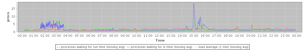 avg(processes waiting for run time) = 0.65 avg(processes waiting for io time) = 0.60 avg(load average (1 min)) = 1.39