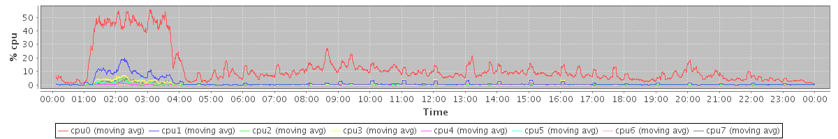 avg(cpu0) = 12.32 avg(cpu1) = 1.49 avg(cpu2) = 0.38 avg(cpu3) = 0.59 avg(cpu4) = 0.17 avg(cpu5) = 0.23 avg(cpu6) = 0.27 avg(cpu7) = 0.26