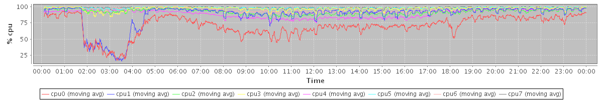avg(cpu0) = 18.44 avg(cpu1) = 8.38 avg(cpu2) = 0.76 avg(cpu3) = 0.60 avg(cpu4) = 0.42 avg(cpu5) = 0.16 avg(cpu6) = 0.27 avg(cpu7) = 0.05