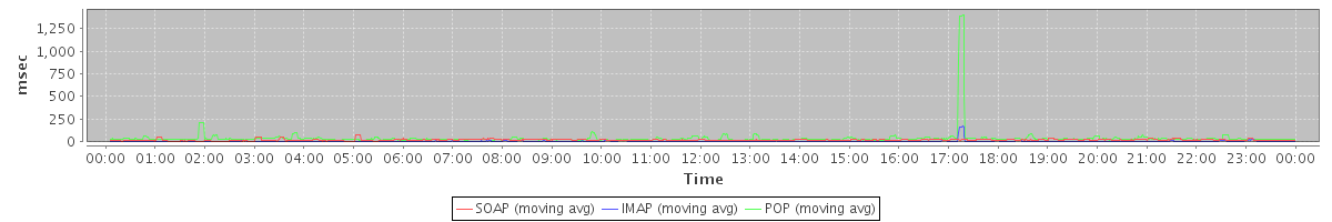 avg(FolderActionRequest.sync) = 2906.00 avg(BrowseRequest) = 432.00 avg(FolderActionRequest.delete) = 777.70 avg(ForwardAppointmentInviteRequest) = 460.50 avg(SendInviteReplyRequest) = 379.03 avg(ApplyFilterRulesRequest) = 2241.50 avg(FolderActionRequest.empty) = 651.16 avg(SyncGalAccountRequest) = 39666.25 avg(BackupRequest) = 630.50 avg(GetQuotaUsageRequest) = 1367.00
