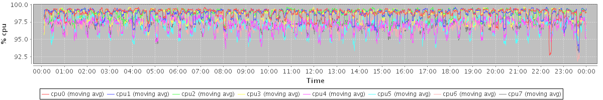 avg(cpu0) = 98.85 avg(cpu1) = 98.70 avg(cpu2) = 98.83 avg(cpu3) = 98.68 avg(cpu4) = 97.02 avg(cpu5) = 96.95 avg(cpu6) = 97.08 avg(cpu7) = 97.14