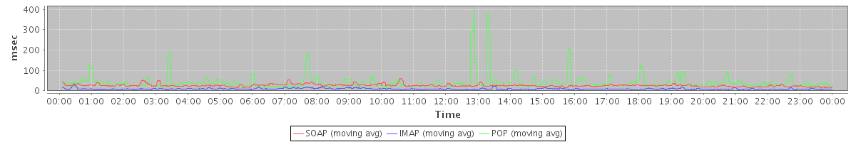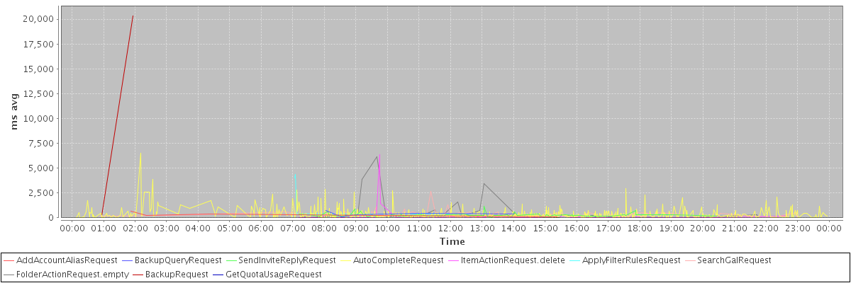 avg(AddAccountAliasRequest) = 343.25 avg(BackupQueryRequest) = 391.60 avg(SendInviteReplyRequest) = 267.82 avg(AutoCompleteRequest) = 356.91 avg(ItemActionRequest.delete) = 282.11 avg(ApplyFilterRulesRequest) = 2286.00 avg(SearchGalRequest) = 317.03 avg(FolderActionRequest.empty) = 619.72 avg(BackupRequest) = 10301.00 avg(GetQuotaUsageRequest) = 1882.00