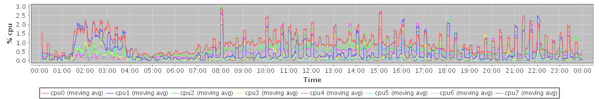 avg(cpu0) = 0.07 avg(cpu1) = 0.13 avg(cpu2) = 0.02 avg(cpu3) = 0.03 avg(cpu4) = 0.02 avg(cpu5) = 0.01 avg(cpu6) = 0.03 avg(cpu7) = 0.01
