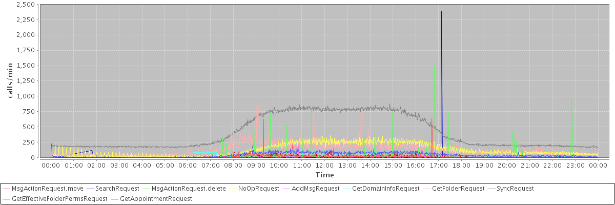 max(MsgActionRequest.move) = 635.00 max(SearchRequest) = 232.00 max(MsgActionRequest.delete) = 1488.00 max(NoOpRequest) = 365.00 max(AddMsgRequest) = 243.00 max(GetDomainInfoRequest) = 153.00 max(GetFolderRequest) = 911.00 max(SyncRequest) = 875.00 max(GetEffectiveFolderPermsRequest) = 117.00 max(GetAppointmentRequest) = 2382.00
