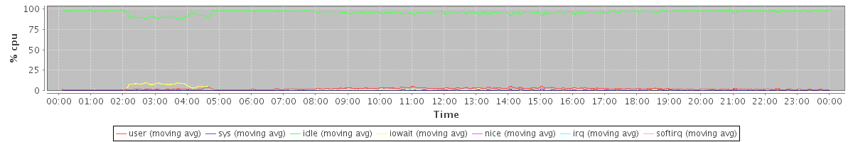 avg(user) = 2.23 avg(sys) = 0.39 avg(idle) = 95.92 avg(iowait) = 1.33 avg(nice) = 0.10 avg(irq) = 0.00 avg(softirq) = 0.04