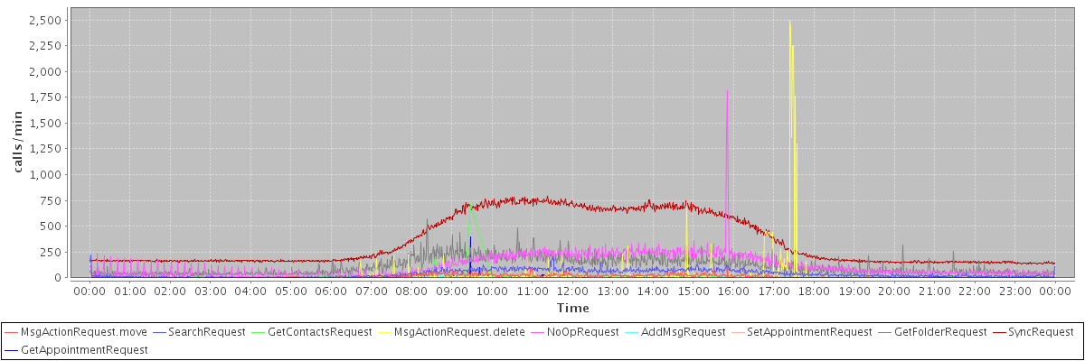 max(MsgActionRequest.move) = 130.00 max(SearchRequest) = 219.00 max(GetContactsRequest) = 709.00 max(MsgActionRequest.delete) = 2499.00 max(NoOpRequest) = 1818.00 max(AddMsgRequest) = 153.00 max(SetAppointmentRequest) = 390.00 max(GetFolderRequest) = 568.00 max(SyncRequest) = 787.00 max(GetAppointmentRequest) = 395.00