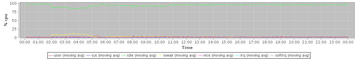 avg(user) = 2.18 avg(sys) = 0.63 avg(idle) = 94.74 avg(iowait) = 2.30 avg(nice) = 0.10 avg(irq) = 0.00 avg(softirq) = 0.07