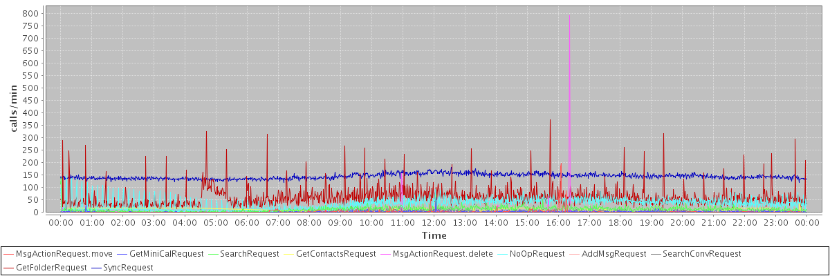 max(MsgActionRequest.move) = 198.00 max(GetMiniCalRequest) = 60.00 max(SearchRequest) = 141.00 max(GetContactsRequest) = 37.00 max(MsgActionRequest.delete) = 792.00 max(NoOpRequest) = 150.00 max(AddMsgRequest) = 89.00 max(SearchConvRequest) = 31.00 max(GetFolderRequest) = 373.00 max(SyncRequest) = 180.00