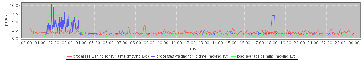 avg(processes waiting for run time) = 0.98 avg(processes waiting for io time) = 0.53 avg(load average (1 min)) = 1.58