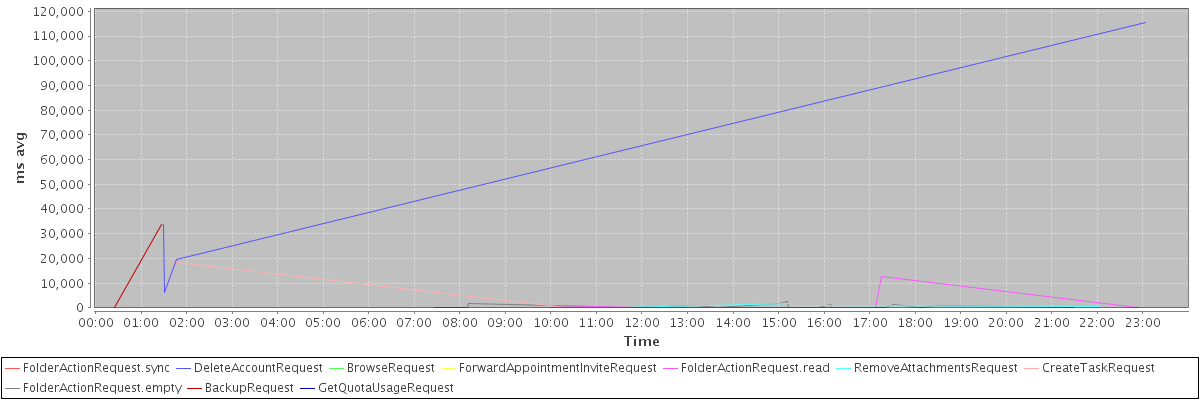 avg(FolderActionRequest.sync) = 700.00 avg(DeleteAccountRequest) = 43680.25 avg(BrowseRequest) = 823.00 avg(ForwardAppointmentInviteRequest) = 349.00 avg(FolderActionRequest.read) = 1210.91 avg(RemoveAttachmentsRequest) = 547.67 avg(CreateTaskRequest) = 3792.80 avg(FolderActionRequest.empty) = 617.71 avg(BackupRequest) = 17013.50 avg(GetQuotaUsageRequest) = 2658.00
