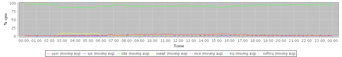 avg(user) = 4.15 avg(sys) = 0.85 avg(idle) = 92.25 avg(iowait) = 2.47 avg(nice) = 0.10 avg(irq) = 0.00 avg(softirq) = 0.16
