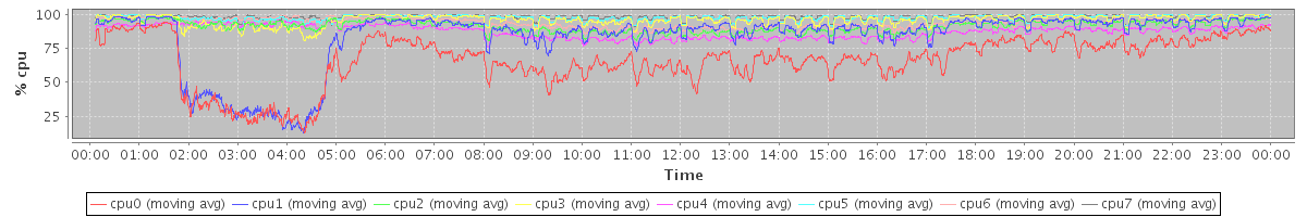 avg(cpu0) = 1.36 avg(cpu1) = 1.05 avg(cpu2) = 1.00 avg(cpu3) = 0.75 avg(cpu4) = 0.86 avg(cpu5) = 0.59 avg(cpu6) = 0.78 avg(cpu7) = 0.46