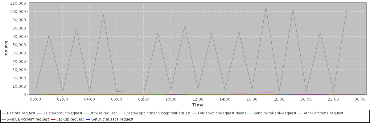 avg(RestoreRequest) = 62320.00 avg(DeleteAccountRequest) = 15844.00 avg(BrowseRequest) = 607.00 avg(CreateAppointmentExceptionRequest) = 301.37 avg(FolderActionRequest.delete) = 431.80 avg(SendInviteReplyRequest) = 321.14 avg(AutoCompleteRequest) = 376.47 avg(SyncGalAccountRequest) = 41550.50 avg(BackupRequest) = 588.00 avg(GetQuotaUsageRequest) = 1128.00