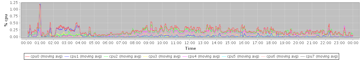 avg(cpu0) = 0.21 avg(cpu1) = 0.05 avg(cpu2) = 0.15 avg(cpu3) = 0.02 avg(cpu4) = 0.13 avg(cpu5) = 0.02 avg(cpu6) = 0.06 avg(cpu7) = 0.00