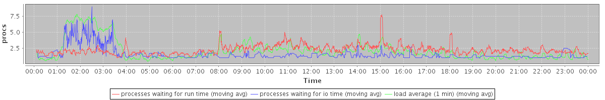 avg(processes waiting for run time) = 1.83 avg(processes waiting for io time) = 0.70 avg(load average (1 min)) = 2.13