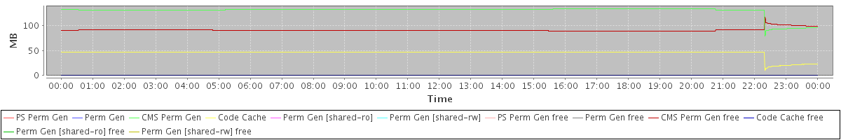 avg(PS Perm Gen) = 0.00 avg(Perm Gen) = 0.00 avg(CMS Perm Gen) = 130.21 avg(Code Cache) = 45.61 avg(Perm Gen [shared-ro]) = 0.00 avg(Perm Gen [shared-rw]) = 0.00 avg(PS Perm Gen free) = 0.00 avg(Perm Gen free) = 0.00 avg(CMS Perm Gen free) = 91.42 avg(Code Cache free) = 0.30 avg(Perm Gen [shared-ro] free) = 0.00 avg(Perm Gen [shared-rw] free) = 0.00