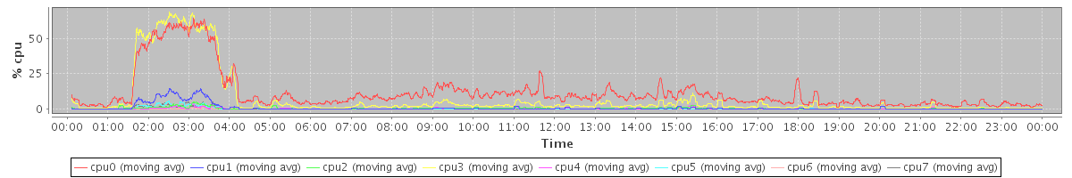 avg(cpu0) = 11.44 avg(cpu1) = 0.85 avg(cpu2) = 0.40 avg(cpu3) = 7.23 avg(cpu4) = 0.24 avg(cpu5) = 0.24 avg(cpu6) = 0.08 avg(cpu7) = 0.21