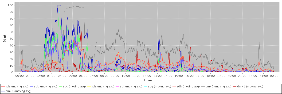 avg(sda) = 11.76 avg(sdb) = 9.31 avg(sdc) = 7.83 avg(sde) = 11.74 avg(sdf) = 9.33 avg(sdg) = 7.82 avg(sdh) = 2.28 avg(dm-0) = 30.71 avg(dm-1) = 5.84 avg(dm-2) = 12.34