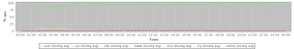 avg(user) = 2.13 avg(sys) = 0.48 avg(idle) = 95.48 avg(iowait) = 1.78 avg(nice) = 0.10 avg(irq) = 0.00 avg(softirq) = 0.05