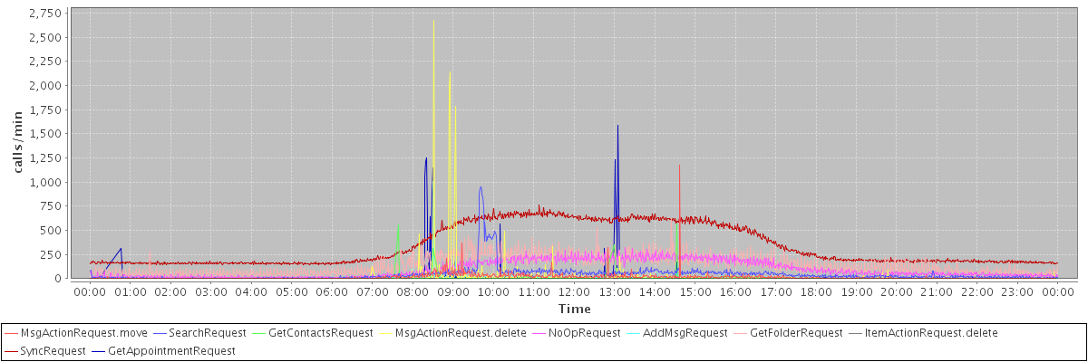 max(MsgActionRequest.move) = 1178.00 max(SearchRequest) = 946.00 max(GetContactsRequest) = 566.00 max(MsgActionRequest.delete) = 2677.00 max(NoOpRequest) = 326.00 max(AddMsgRequest) = 1008.00 max(GetFolderRequest) = 623.00 max(ItemActionRequest.delete) = 170.00 max(SyncRequest) = 763.00 max(GetAppointmentRequest) = 1588.00